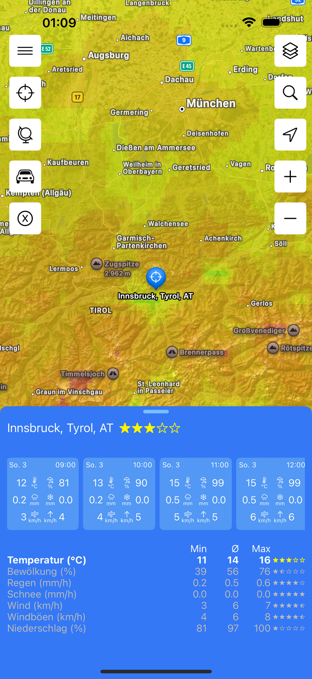 SunOnly verwendet Wetterdaten von OpenWeather.org, die auch von Unternehmen wie Google, facebook, Amazon, Microsoft, booking.com, airBnB, TomTom und vielen mehr genutzt werden. OpenWeather berechnet die Wetterprognosen weltweit mit einer Genauigkeit von 2km x 2km, in manchen Regionen mit 500m x 500m (in den Commonwealth Staaten) und aktualisiert sie jede Stunde. Die von SunOnly verwendete Auflösung und das Aktualisierungsintervall hängt davon ab, ob der Nutzer die kostenlose oder die Pro Edition verwendet und welche Dimension die gerade betrachtete Karte hat.